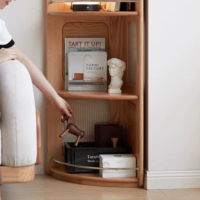 A refined solid ash corner bookcase with elegant glass detailing and natural warmth.