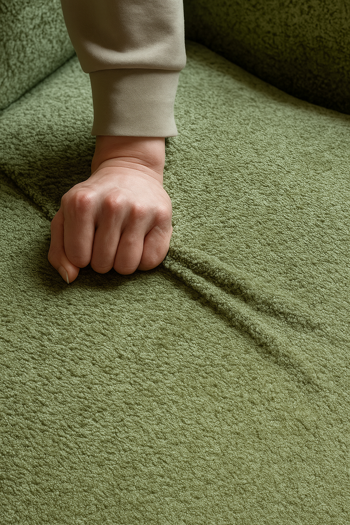 The Loma Sofa combines modern softness with balanced support. Upholstered in plush faux lamb wool in matcha green, it offers a cosy and inviting texture. The wide seat and gently curved silhouette create a relaxing, cloud-like comfort — perfect for long lounging hours.