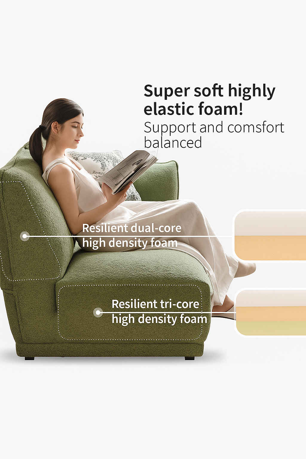 The Loma Sofa blends a minimalist profile with luxurious comfort. Its 70% resilience and 30% softness ratio ensures lasting support without compromising on sink-in comfort — ideal for both living rooms and reading corners.
