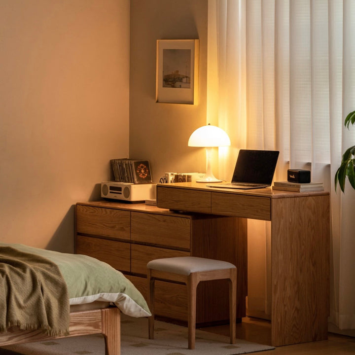 Bring balance and beauty to your space with the Yoyu Desk, crafted from 100% natural solid oak. Featuring a clean silhouette, rounded mirror, and practical storage, it blends Scandinavian simplicity with everyday functionality.